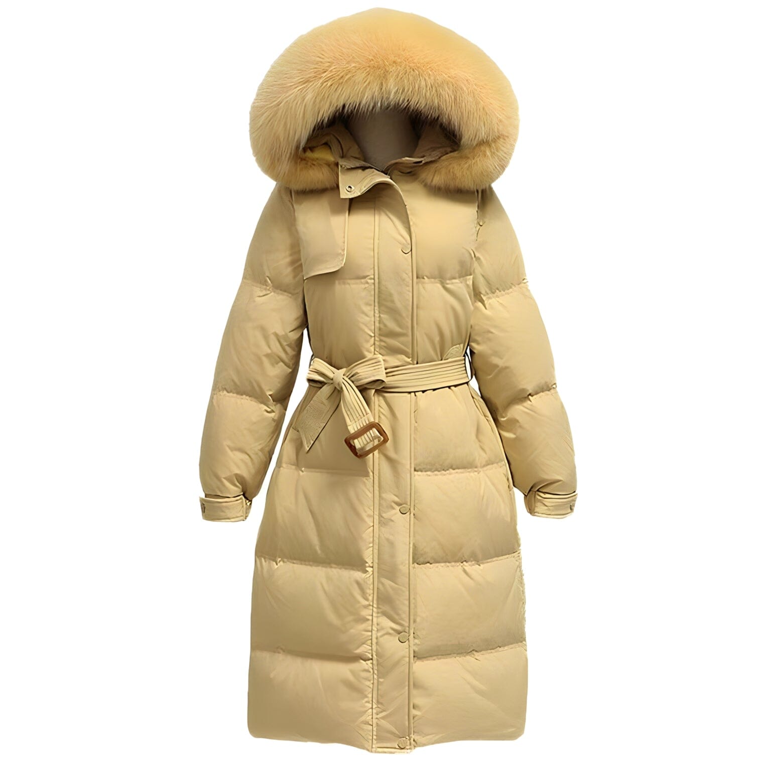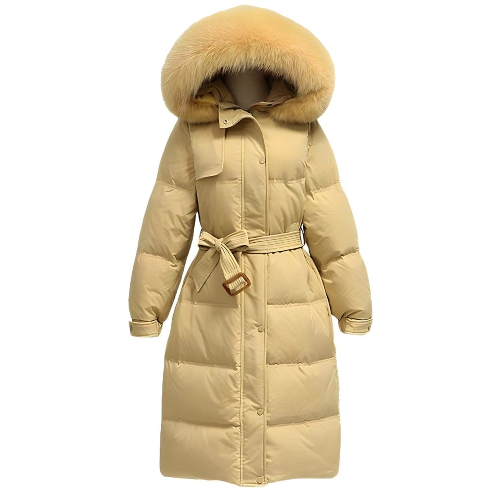 Radiant poise and confidence in this luxurious winter overcoat, offering a unique blend of vintage fashion with cozy winter comfort. The winter overcoat features a premium polyester-cotton fabric composition, oversized faux fur lined hood, long tail mid-drift accent belt and intricate durable construction throughout. Reserved exclusively for the bold.